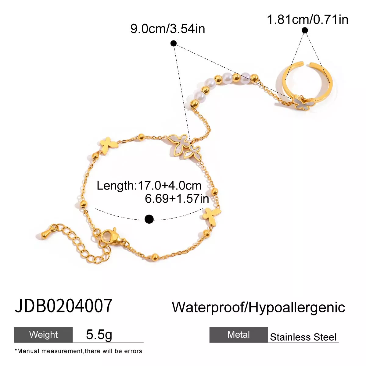 Crafted from high-quality stainless steel with a luxurious 18K PVD gold coating, this bracelet is both waterproof and resistant to everyday wear. The unique design features a butterfly motif with a luminous pearl accent, gracefully linking the finger ring and bracelet with a sleek chain. It’s lightweight, weighing only 0.21 oz (6g), and made to fit comfortably for all-day wear.
