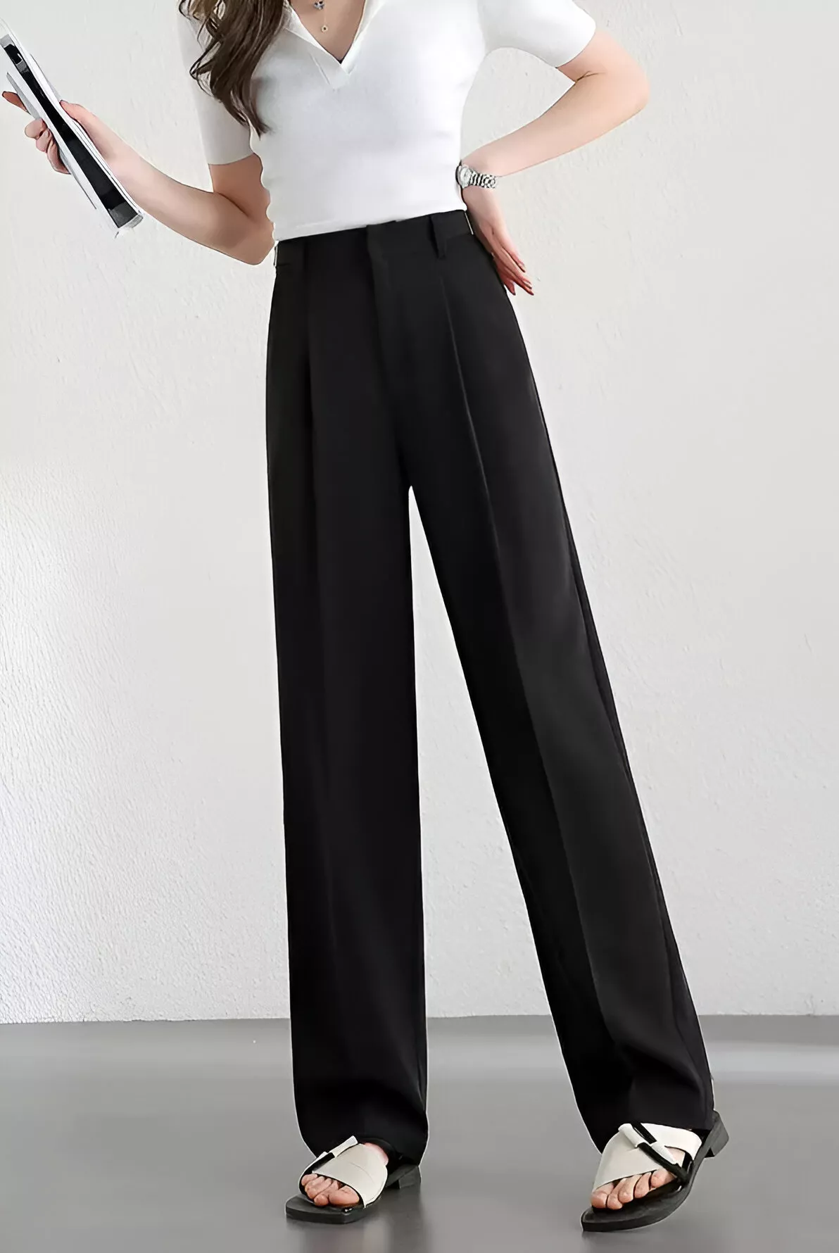 Crafted from a breathable woven fabric blend of polyester and spandex, these pants offer a smooth, structured drape without any stiffness. The mid-rise waist flatters your natural shape, while the straight-leg cut elongates your silhouette. The tailored pleated front adds sophistication, and the full-length design (approximately 40 inches) makes them ideal for pairing with heels or flats. Practical details like side pockets and faux zipper accents lend a refined touch to their minimalist style.