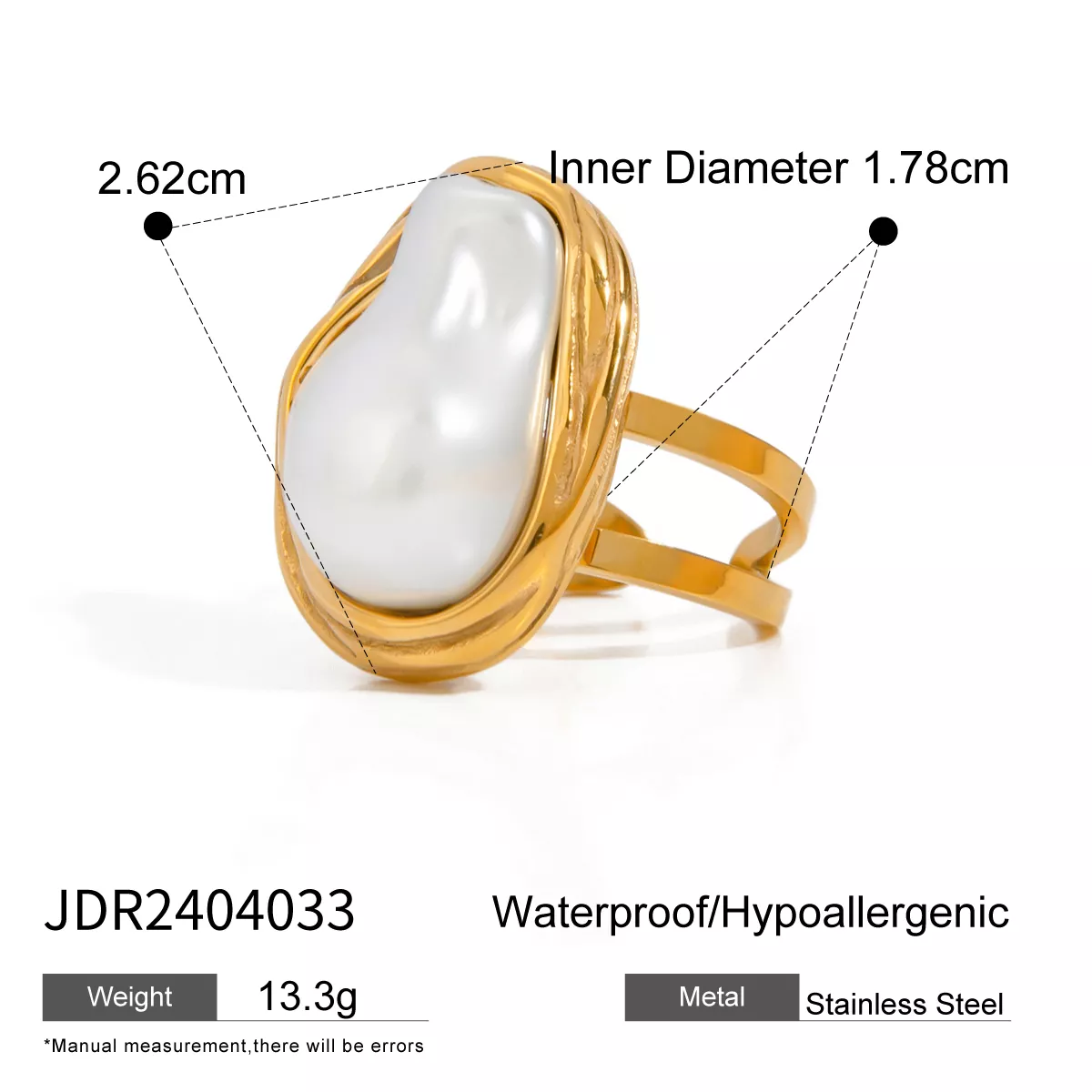 The ring features a refined baroque pearl inlay that gives it a soft, organic look—perfectly complemented by the brilliant 18K gold plating over durable stainless steel. The open design makes it easy to wear and adjust, giving you both comfort and style in one statement piece. Its geometric shape adds a modern twist to a classic look, while the high-polish finish radiates understated luxury.