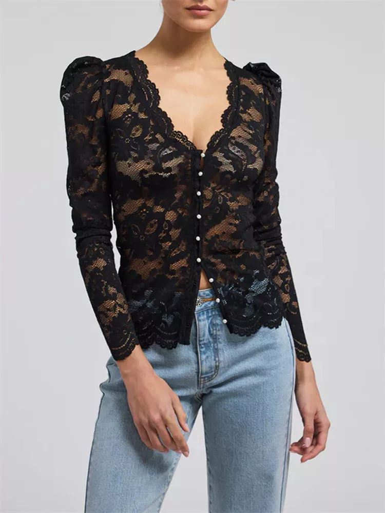 Unlike ordinary blouses, this one features a blend of bold and feminine with its transparent lace and elegant tailoring. The solid floral mesh detail is striking yet wearable, making it a standout piece in any wardrobe. With its mix of stretch and structure, it flatters a variety of body types while offering enough comfort to wear all day or night.