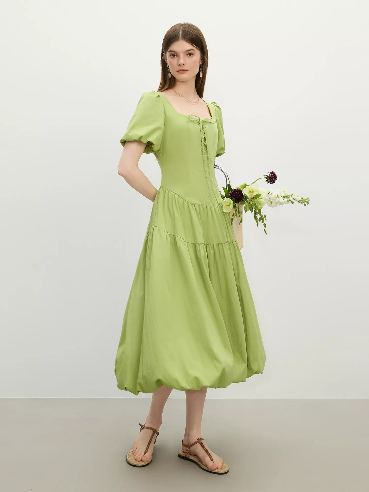 Perfect for garden parties, weekend brunches, or casual outings, this dress offers a versatile yet polished look. The soft puff sleeves add a touch of romance, while the slim straps and tailored waistline flatter your figure without feeling tight. Whether you’re strolling through the city or heading out for a date, this dress makes dressing up feel effortless.
