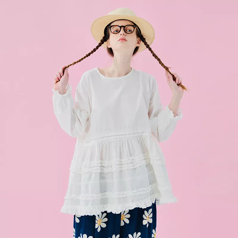 Japanese Cotton Lace Hoodie Top – Washed Casual Pullover for Women