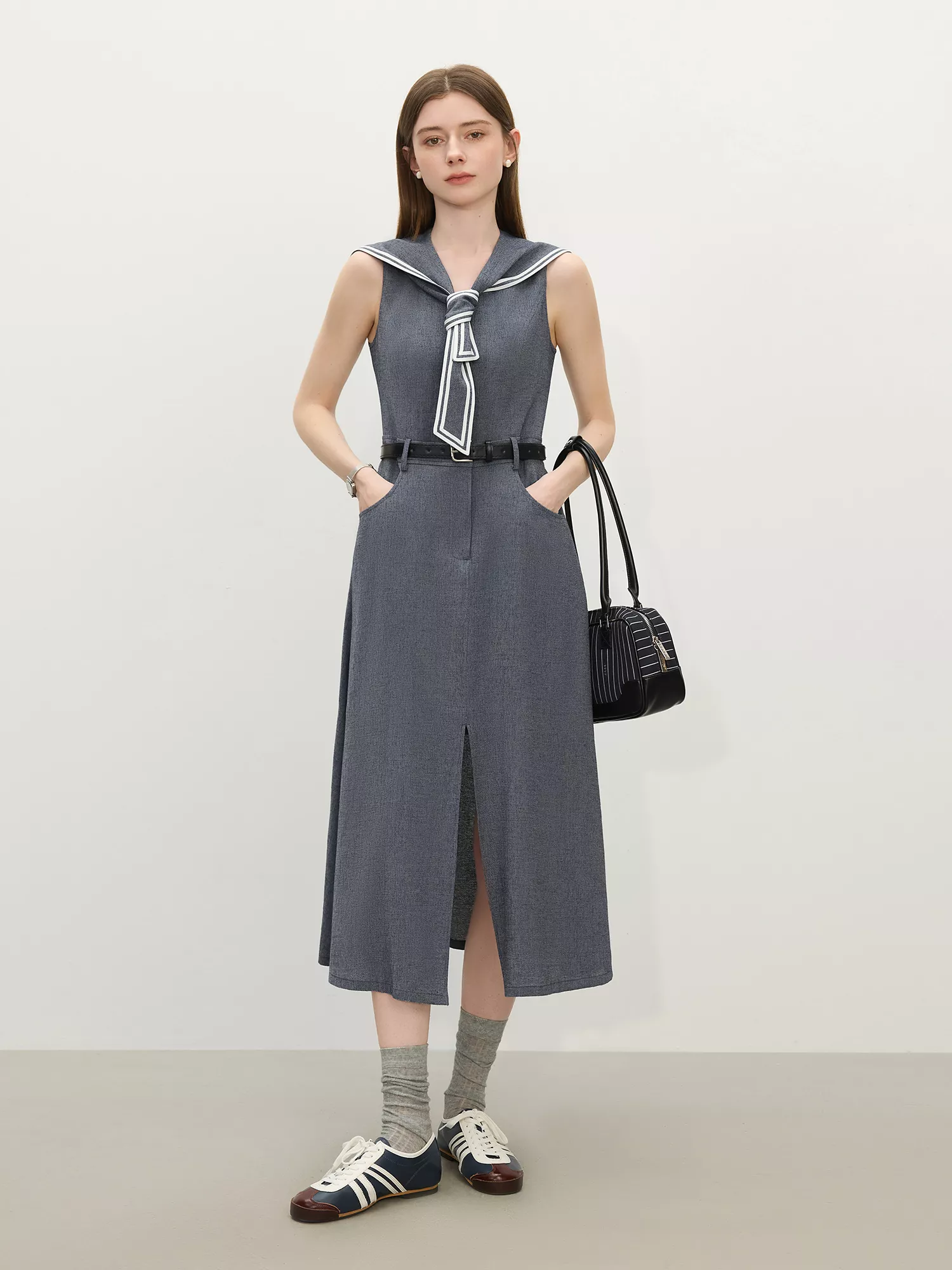 Crafted from a premium blend of rayon, polyester, and linen, this dress offers a soft, breathable feel without sacrificing structure. The sleeveless cut and slim-fit bodice enhance your silhouette, while the sailor-inspired collar adds a touch of vintage polish. Although it has a denim-inspired look, the knit viscose fabric ensures it’s lightweight and easy to wear—perfect for sunny days and warm evenings.