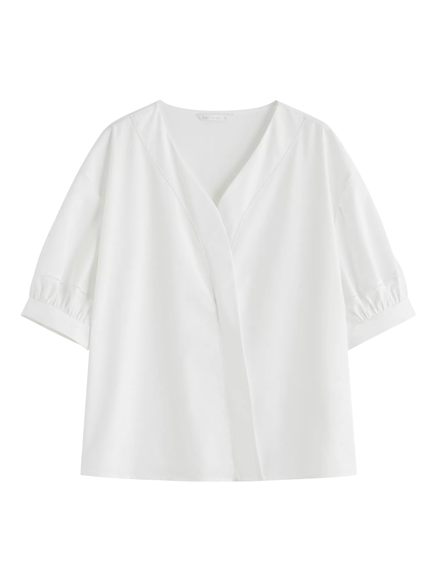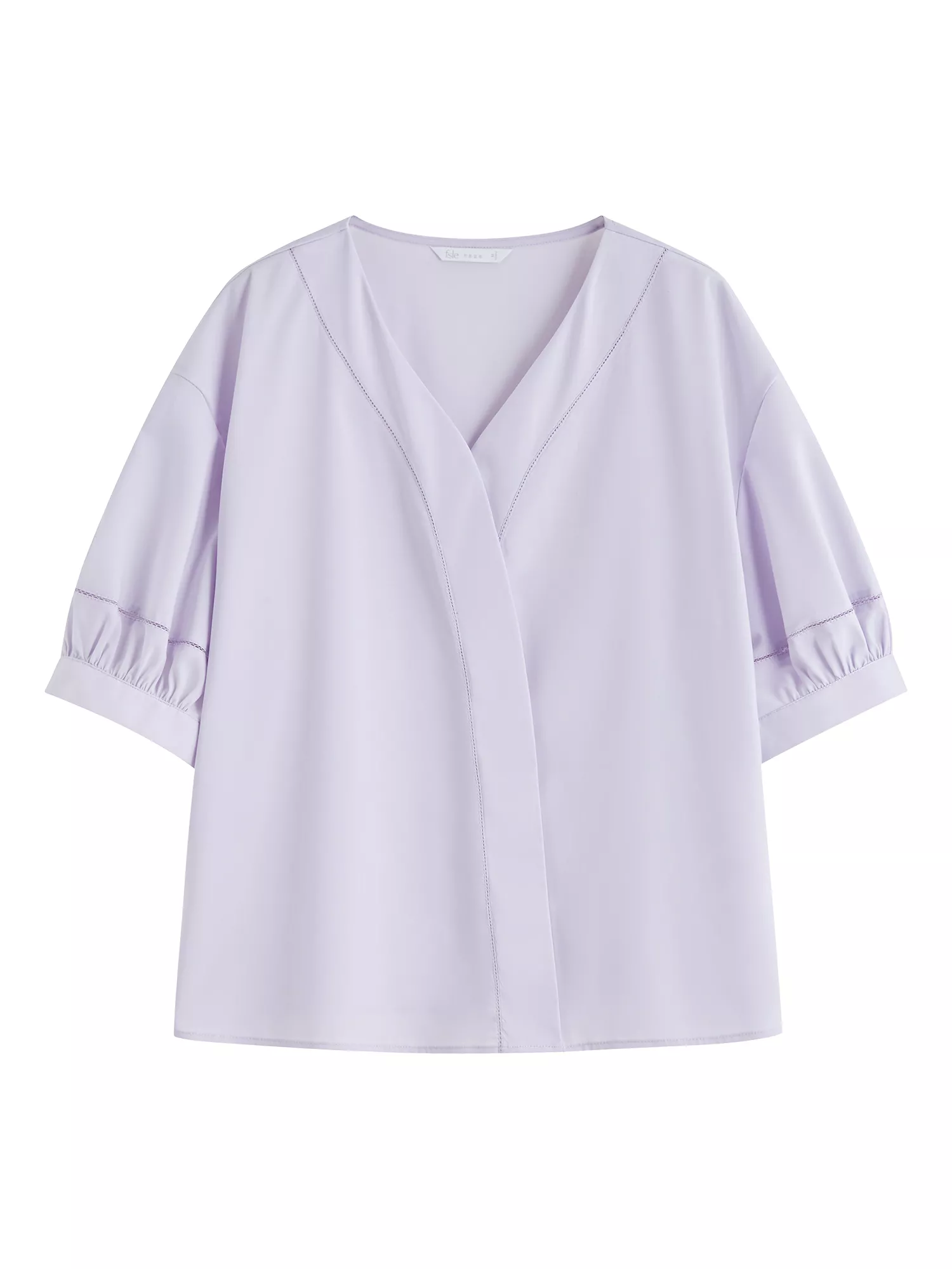 Crafted from a breathable broadcloth fabric with a soft synthetic fiber blend—76.6% polyester, 18.7% modal, and 4.7% spandex—this shirt offers just the right amount of stretch for ease of movement while remaining light and airy against the skin. The half-length sleeves and straight silhouette create a polished yet relaxed silhouette suitable for women of all ages, especially those who appreciate timeless style with a modern twist.