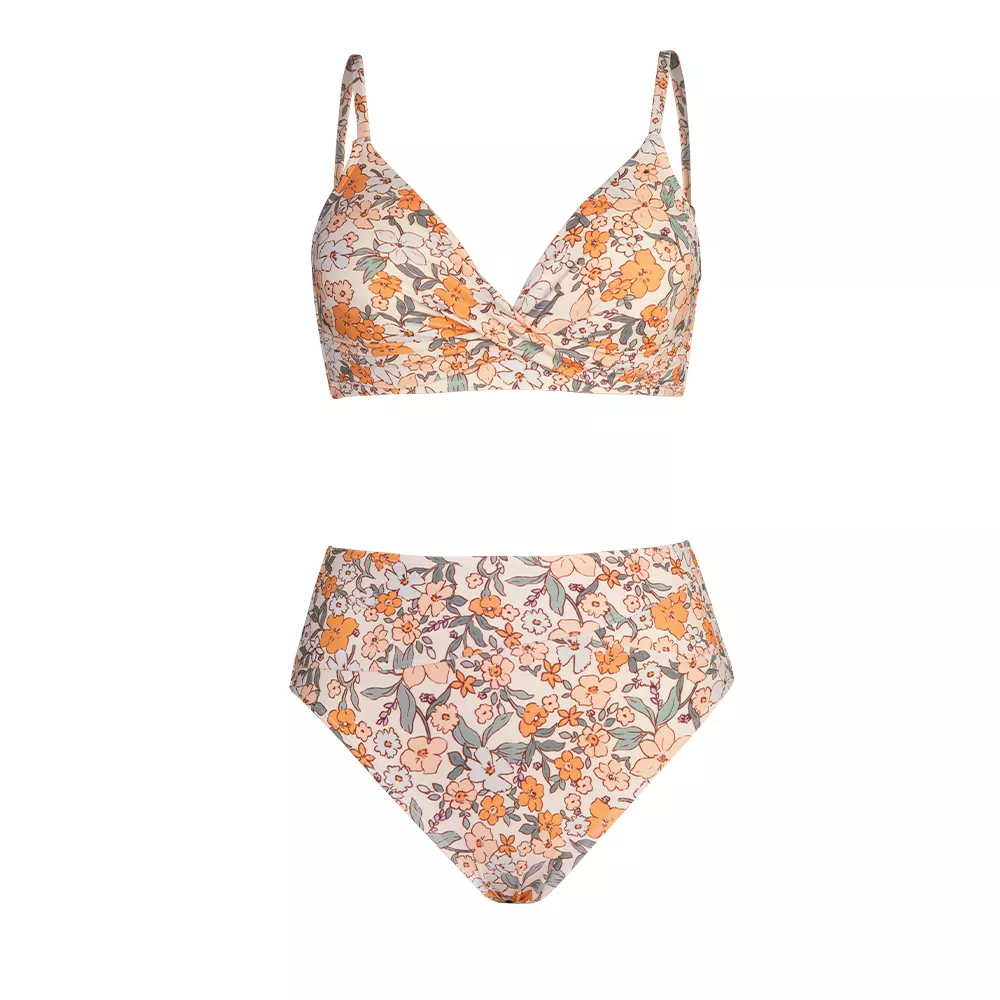 Featuring a bold orange floral pattern, this two-piece swimsuit combines comfort and style, making it the perfect choice for your next beach getaway or poolside escape. Whether you’re lounging by the water or diving into the waves, this high-waisted bikini oyffers the support and coverage you need without compromising on flair.