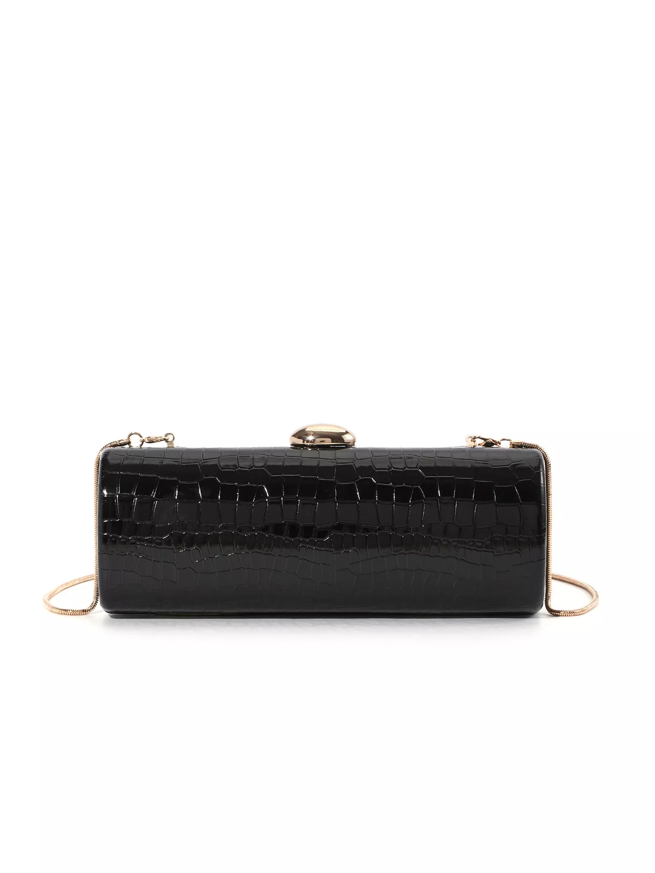 Its structured design and firm build help maintain its elegant shape, while the solid color and subtle chain detailing bring a polished look to any ensemble. With its compact silhouette, this clutch fits comfortably in your hand or can be worn over the shoulder using the detachable chain strap for hands-free convenience. The hasp closure ensures your essentials stay secure while giving quick access when needed.