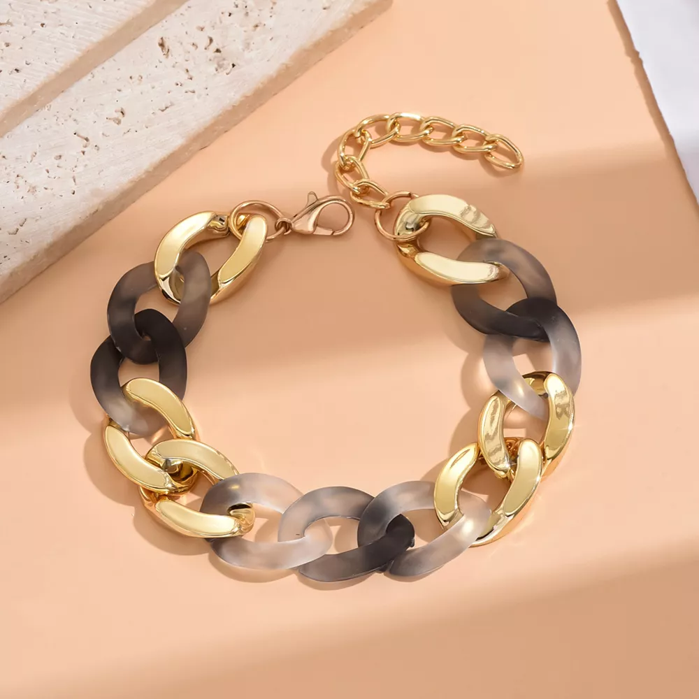 Designed with an eye-catching contrast and oversized links, this accessory doubles as both a bracelet and a choker depending on your style mood. Its lightweight 0.5 oz (15g) construction ensures all-day comfort, while the glossy acrylic finish adds a touch of high-shine drama. The bold gold tone enhances any outfit and brings that perfect Y2K retro energy that’s trending hard right now.
